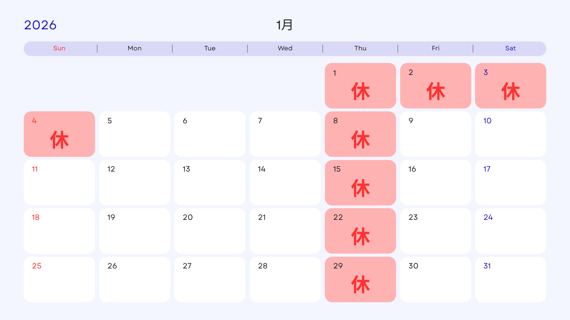■営業カレンダー:「休」印は休業日です。記載のない日は通常営業となります。